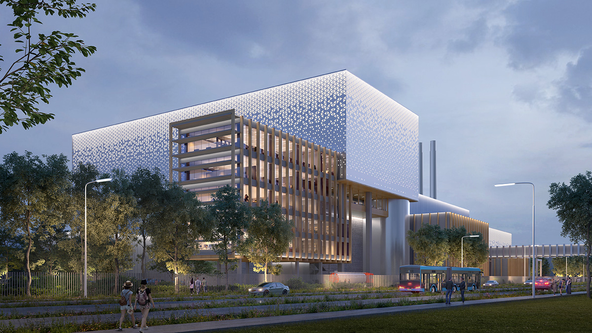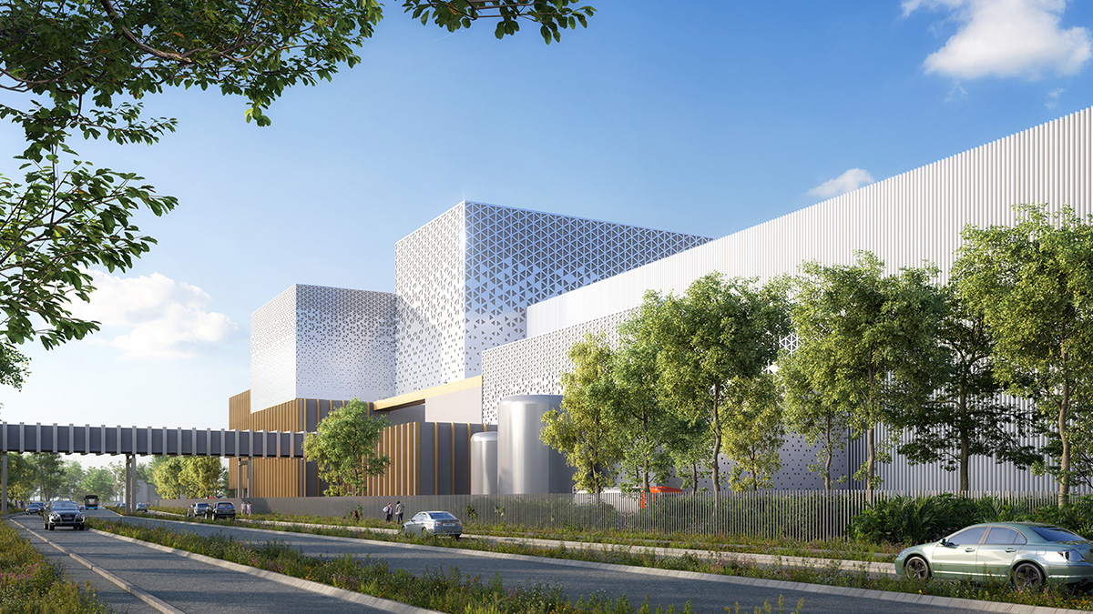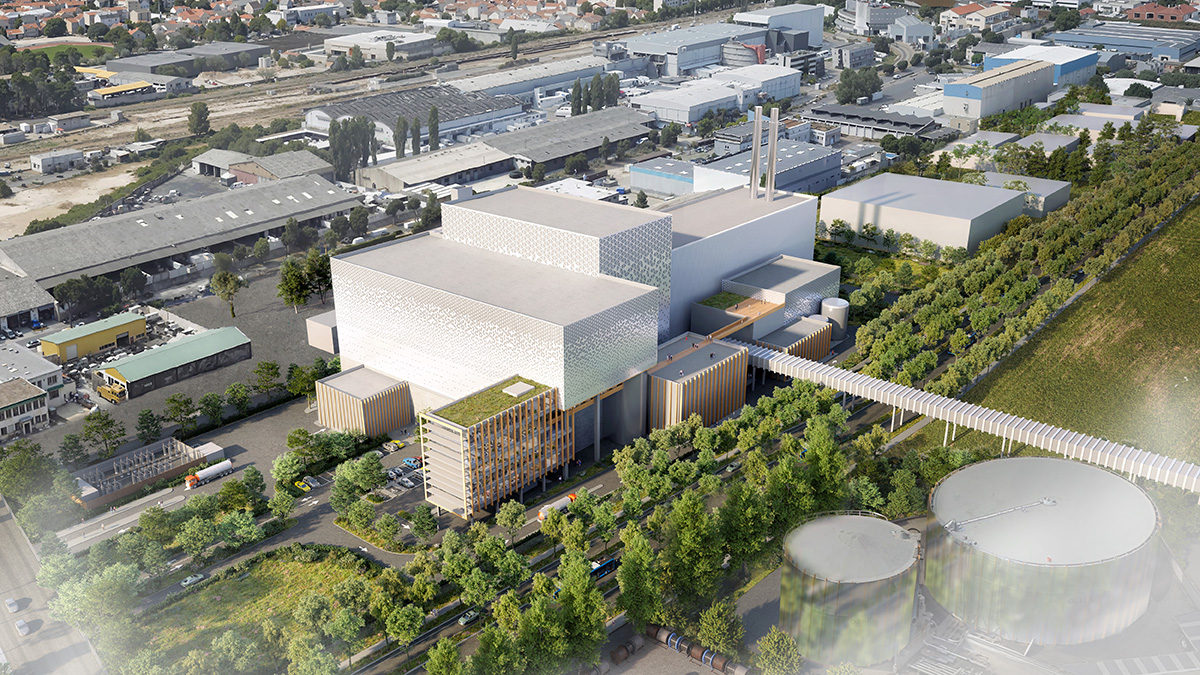 La volumétrie est volontairement fragmentée afin de maîtriser la monumentalité de l’UVE, en distinguant de grands volumes techniques en cœur de site et des bâtiments à échelle plus domestique le long des futurs axes urbains. L’architecture revendique l’héritage des grandes figures industrielles, avec des façades sobres, rythmées et sans arrière-plan, associant bardages métalliques perforés et éléments bois.
